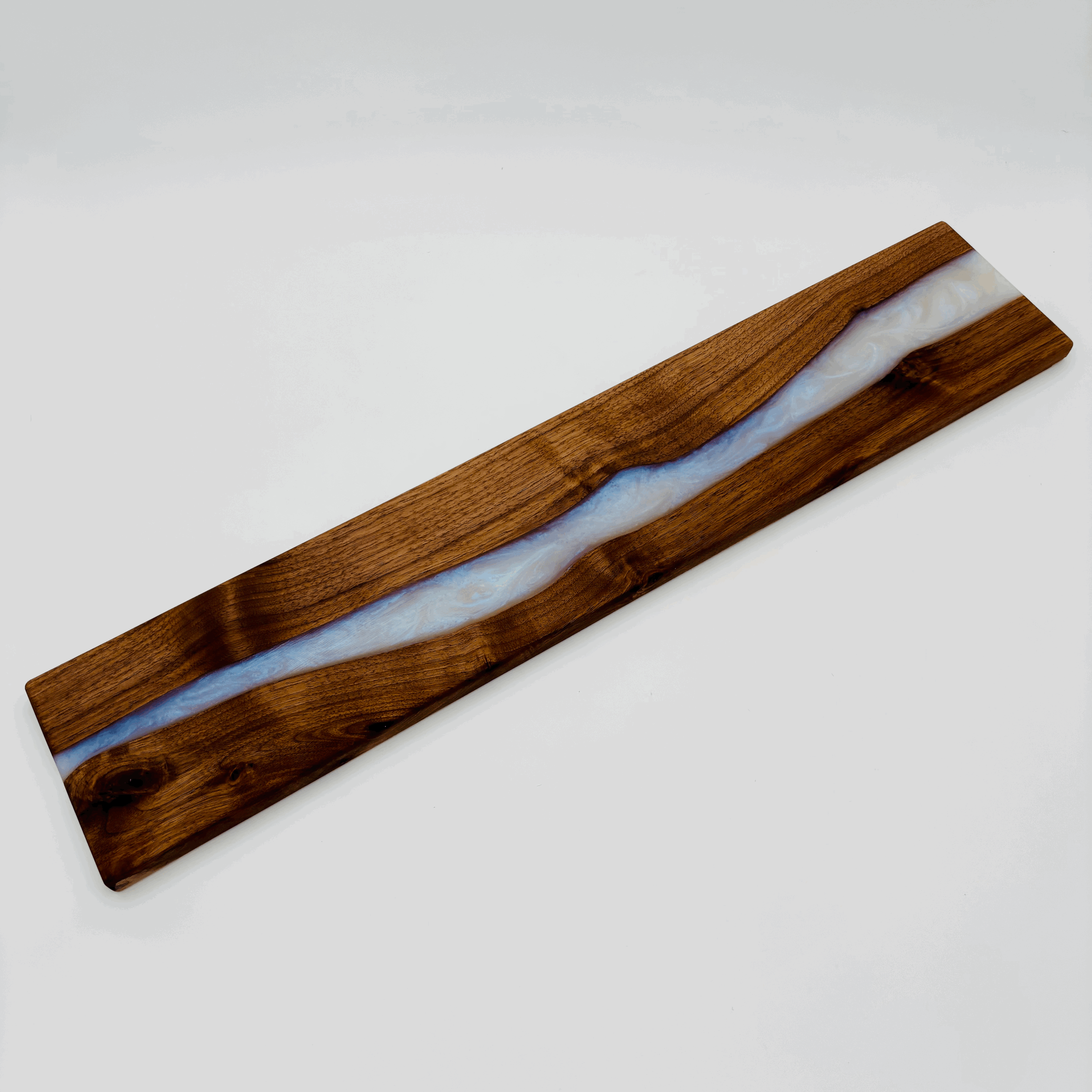 Made with walnut wood and white resin. Makes a great gift for birthdays, weddings, hostess, holidays, etc. We can engrave a similar board and add handles for an additional charge. 26” long x 6” wide