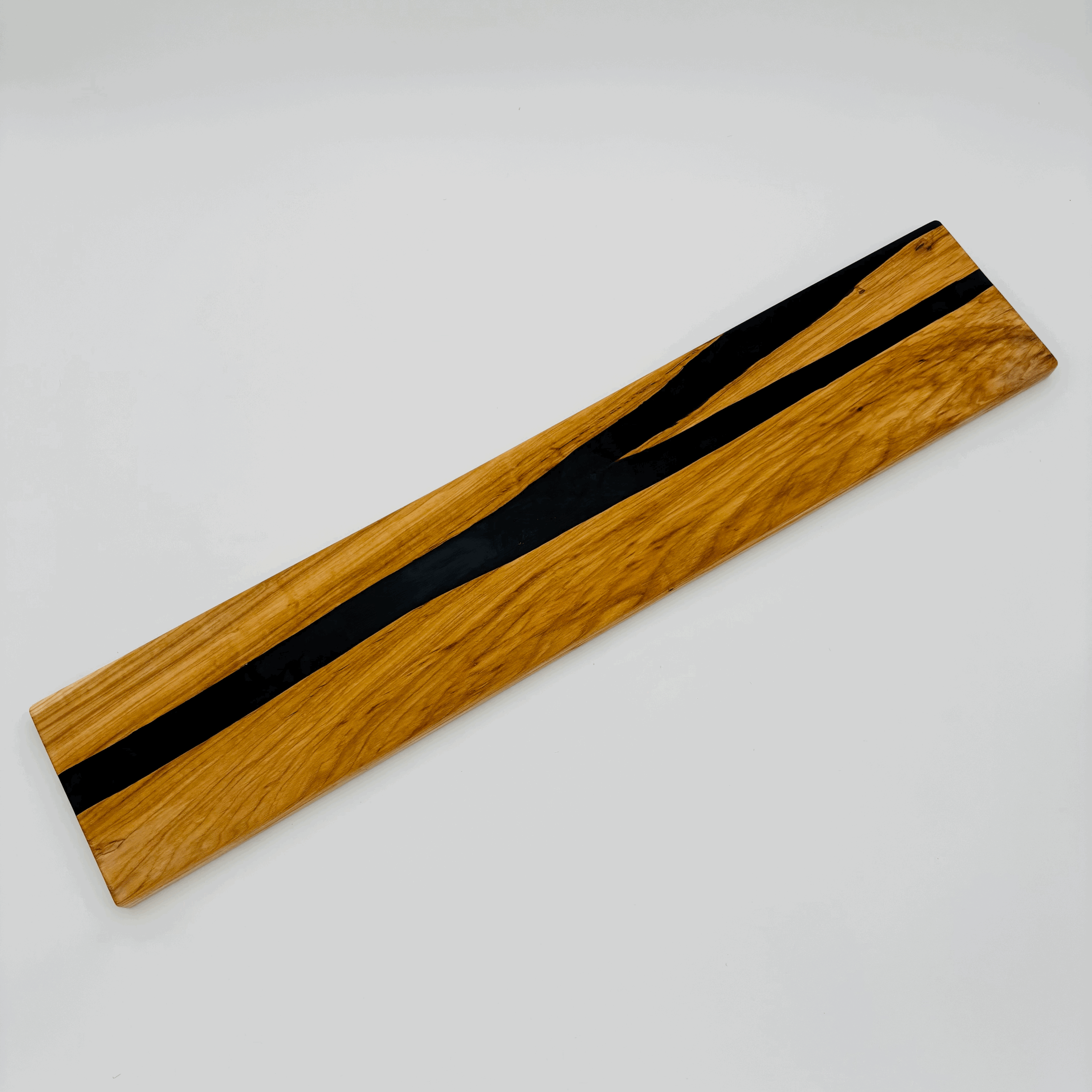 Made with pecan wood and black resin. Makes a great gift for birthdays, weddings, hostess, and the holidays. We can engrave a similar board and add handles for an additional charge. 26” long x 6” wide