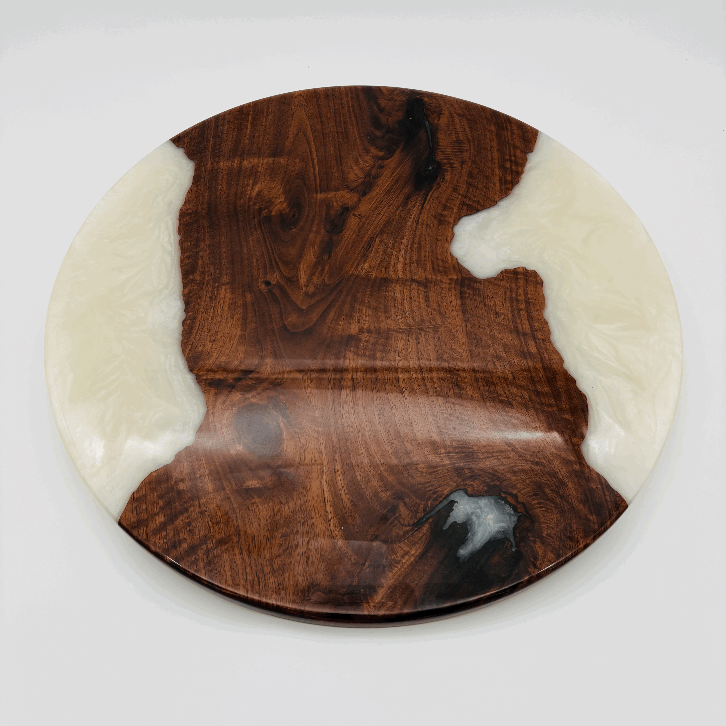 Made with walnut wood and white resin. Turns in circles for easy access. Perfect for the middle of a table or kitchen island.