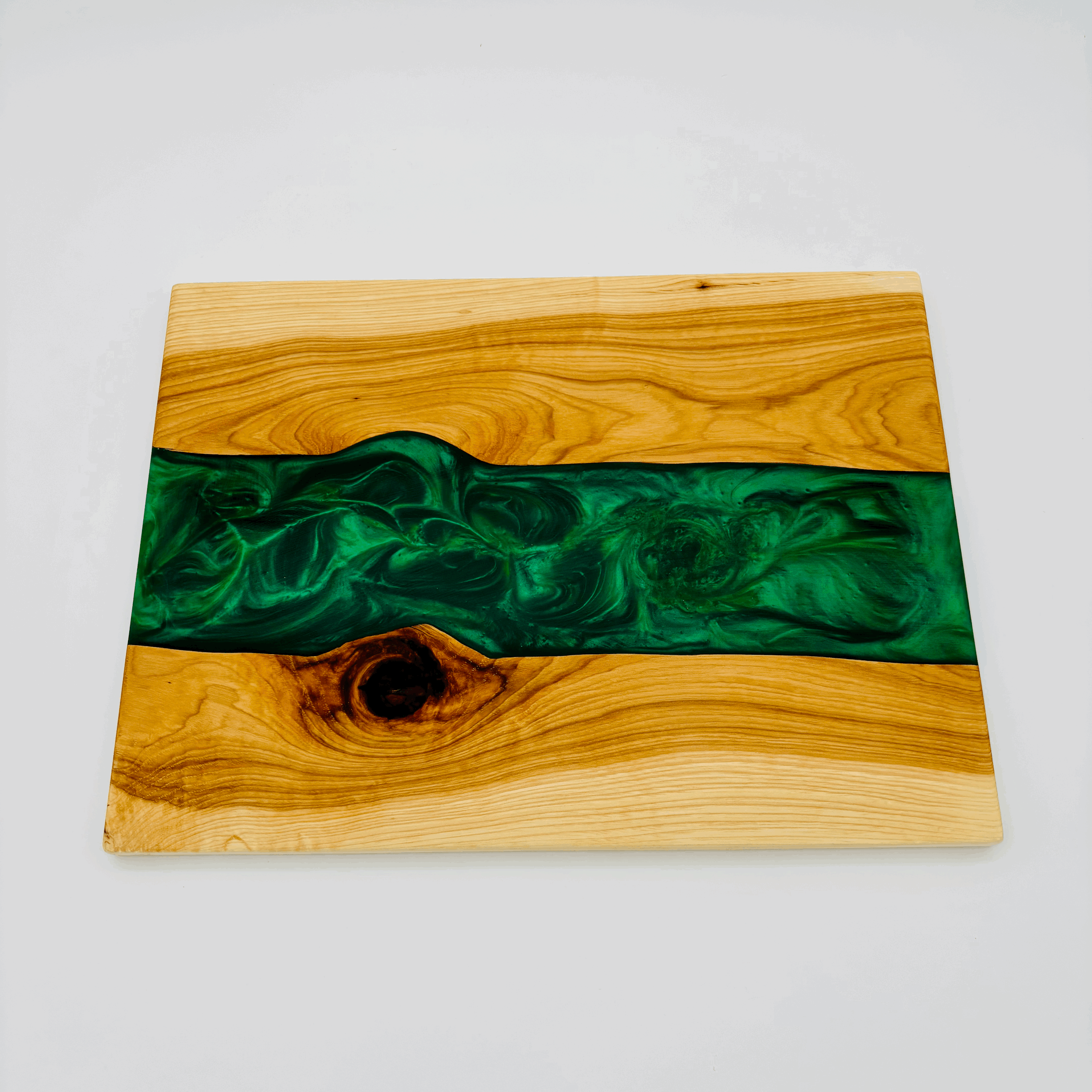 Made with pecan wood and green resin. Makes a great gift for birthdays, weddings, hostess, and the holidays. We can engrave a similar board and add handles for an additional charge. 17” x 13”