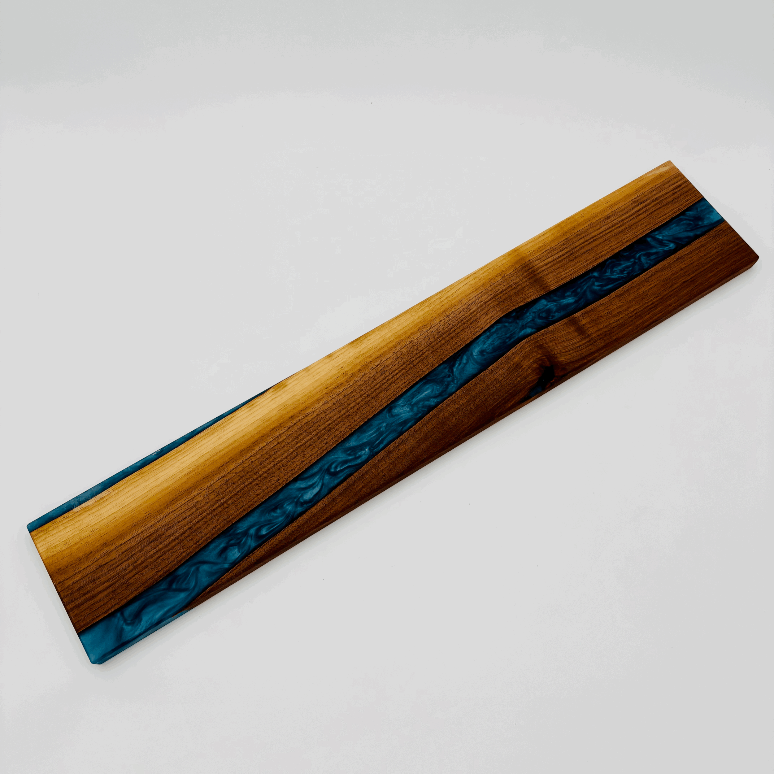 Made with walnut wood and blue resin. Makes a great gift for birthdays, weddings, hostess, holidays, etc. We can engrave a similar board and add handles for an additional charge. 26” long x 6” wide